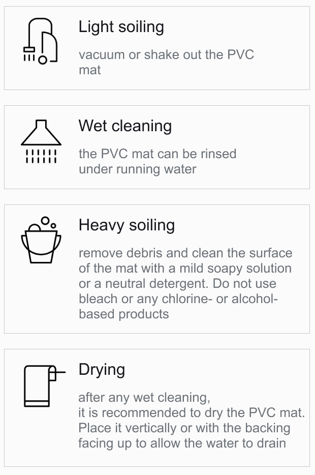 • PVC doormats are completely new (delivered directly from the factory). If you notice an unusual smell after unpacking, let the mat air out for a while outdoors before use
